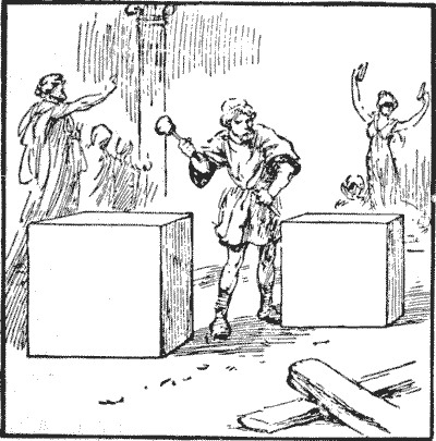 פסל קדום הוזמן לספק שני פסלים, כל אחד על גבי כן מעוקב. אנו עוסקים בכנים אלה. הם היו בגדלים שונים, כפי שניתן לראות באיור, וכאשר הגיע הזמן לתשלום התגלעה מחלוקת בשאלה האם ההסכם התבסס על מדידה קווית או מעוקבת. אך ברגע שהם באו למדוד את שני הכנים, העניין הוסדר מיד, מכיוון שמספר הרגליים הקווי היה זהה בדיוק למספר הרגליים המעוקב. החידה היא למצוא את המידות לשני כנים בעלי תכונה זו, במספרים הקטנים ביותר האפשריים. אתם מבינים, אם שני הכנים, למשל, מודדים `3` רגל ו-`1` רגל בכל צד, אז המדידה הקווית תהיה `4` רגל והתכולה המעוקבת `28` רגל, שאינם זהים, כך שהמידות האלה לא יתאימו.