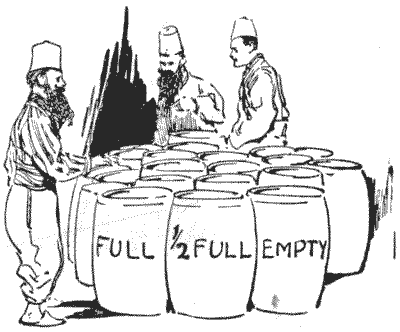 הקושי היחיד שהתעורר היה בנוגע למלאי הדבש. היו בדיוק עשרים ואחת חביות. הזקן השאיר הוראות שלא רק שכל בן יקבל כמות שווה של דבש, אלא יקבל בדיוק את אותו מספר חביות, ושאף דבש לא יועבר מחבית לחבית בגלל הבזבוז הכרוך בכך. כעת, מכיוון ששבע מהחביות הללו היו מלאות בדבש, שבע היו חצי מלאות ושבע היו ריקות, התברר שזה די פאזל, במיוחד כאשר כל אח התנגד לקחת יותר מארבע חביות מאותו תיאור—מלאות, חצי מלאות או ריקות. האם אתה יכול להראות כיצד הם הצליחו לבצע חלוקה נכונה של הרכוש?