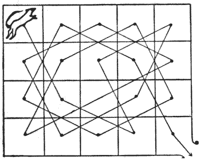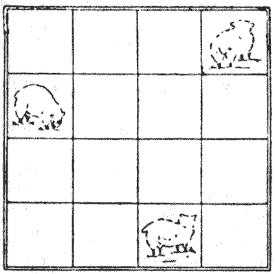 לחקלאי היו שלוש כבשים וסידור של שש עשרה מכלאות, המחולקות על ידי גדרות באופן המצוין באיור. בכמה דרכים שונות הוא יכול למקם את הכבשים האלה, כל אחת במכלאה נפרדת, כך שכל מכלאה תהיה מאוכלסת או בשורה (אופקית, אנכית או אלכסונית) עם כבשה אחת לפחות? נתתי סידור אחד שמקיים את התנאים. כמה אחרים אתה יכול למצוא? אין לספור היפוכים ושיקופים כדברים שונים. הקורא רשאי להתייחס לכבשים כמלכות. הבעיה היא אז למקם את שלוש המלכות כך שכל משבצת תהיה מאוכלסת או מותקפת על ידי מלכה אחת לפחות - במספר המרבי של דרכים שונות.