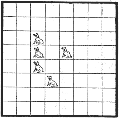 האיור אמור לייצג סידור של שישים וארבעה מְלוּנוֹת. ניתן לראות שחמש מְלוּנוֹת מכילות כל אחת כלב, ובבדיקה נוספת ניתן לראות שכל אחת משישים וארבע המְלוּנוֹת נמצאת בקו ישר עם לפחות כלב אחד - או אופקית, אנכית או באלכסון. קח כל מְלוּנָה שתרצה, ותגלה שתוכל למתוח קו ישר לכלב באחת משלוש הדרכים שהוזכרו. החידה היא להחליף את חמשת הכלבים ולגלות בכמה דרכים שונות ניתן להציב אותם בחמש מְלוּנוֹת בשורה ישרה, כך שכל מְלוּנָה תמיד תהיה בקו אחד עם לפחות כלב אחד. היפוכים ושיקופים נחשבים כאן כשונים.