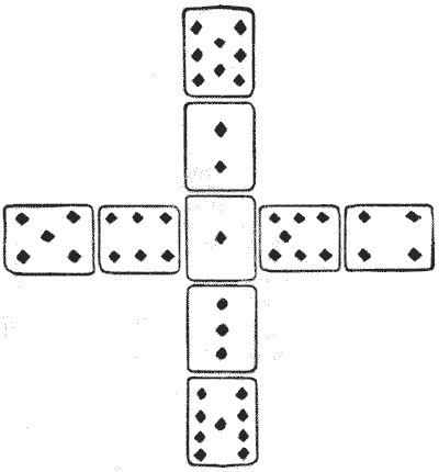 במקרה זה אנו משתמשים רק בתשעה קלפים - האס עד תשע יהלומים. החידה היא לסדר אותם בצורת צלב, בדיוק כפי שמוצג באיור, כך שהנקודות בפס האנכי ובפס האופקי יסתכמו באופן שווה. בדוגמה הנתונה, ניתן לראות ששני הכיוונים מסתכמים ל-`23`. מה שאני רוצה לדעת הוא, כמה דרכים שונות יש לסדר מחדש את הקלפים כדי להגיע לתוצאה זו? ניתן לראות כי, מבלי להשפיע על הפתרון, אנו יכולים להחליף את ה-`5` עם ה-`6`, את ה-`5` עם ה-`7`, את ה-`8` עם ה-`3`, וכן הלאה. כמו כן, אנו יכולים לגרום לפסים האופקי והאנכי להחליף מקומות. אבל מניפולציות ברורות כאלה אינן נחשבות לפתרונות שונים. כולן וריאציות בלבד של פתרון יסודי אחד. עכשיו, כמה פתרונות שונים באופן מהותי כאלה יש? הנקודות לא צריכות, כמובן, תמיד להסתכם ל-`23`.