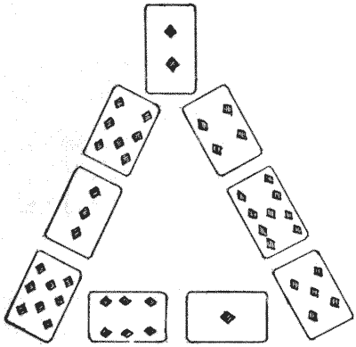 כאן עליך לבחור את תשעת הקלפים, אס עד תשע יהלומים, ולסדר אותם בצורת משולש, בדיוק כפי שמוצג באיור, כך שהנקודות יסתכמו לאותו דבר בכל שלושת הצדדים. בדוגמה הנתונה ניתן לראות שהם מסתכמים ל-`20` בכל צד, אך למספר המסוים אין חשיבות כל עוד הוא זהה בכל שלושת הצדדים. החידה היא לגלות בכמה דרכים שונות ניתן לעשות זאת.