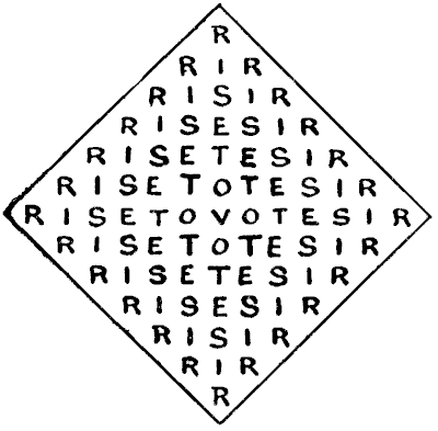 כאן יש לנו, אולי, את הצורה המעניינת ביותר של החידה. בכמה דרכים שונות ניתן לקרוא את הציווי הפוליטי, "RISE TO VOTE, SIR," תחת אותם תנאים כמו קודם? במקרה זה, כל קריאה של הפלינדרום מחייבת שימוש ב-V המרכזי כאות האמצעית.