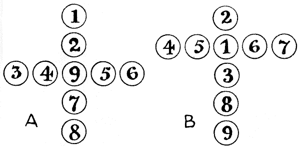 כל מה שאנחנו צריכים לפאזל הזה הם תשעה מוֹנִים, ממוספרים `1, 2, 3, 4, 5, 6, 7, 8` ו-`9`. ניתן לראות באיור A שהם מסודרים כך שיוצרים צלב יווני, ואילו במקרה של B הם יוצרים צלב לטיני. בשני המקרים הקורא יגלה שסכום המספרים באנך של הצלב זהה לסכום המספרים בזרוע האופקית. קל למדי להגיע לסידור כזה בניסוי וטעייה, אך הבעיה היא לגלות בדיוק בכמה דרכים שונות ניתן לעשות זאת בכל מקרה. זכרו שהיפוכים ושיקופים אינם נחשבים כשונים. כלומר, אם תסובבו את הדף הזה תקבלו ארבעה סידורים של הצלב היווני, ואם תסובבו אותו שוב מול מראה תקבלו ארבעה נוספים. אבל את שמונתם אלה מחשיבים כזהים. עכשיו, כמה דרכים שונות יש בכל מקרה?
