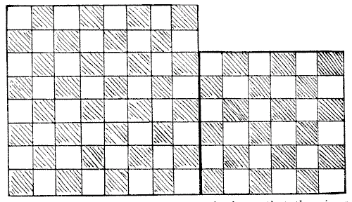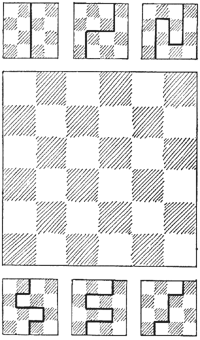 ברור שלוח של ארבעה ריבועים יכול להיות מחולק רק בדרך אחת - על ידי חיתוך ישר במרכז - מכיוון שלא נספור היפוכים ושיקופים כשונים. במקרה של לוח של שישה עשר ריבועים - ארבעה על ארבעה - יש בדיוק שש דרכים שונות. נתתי את כולן בתרשים, והקורא לא ימצא אחרות. כעת, קחו את הלוח הגדול יותר של שלושים ושישה ריבועים, ונסו לגלות בכמה דרכים ניתן לחתוך אותו לשני חלקים באותו גודל וצורה.