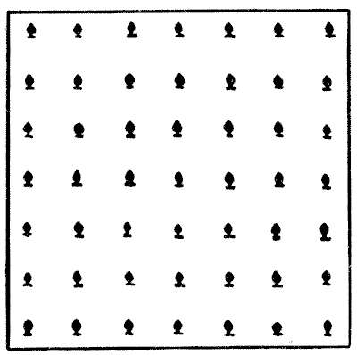 אם יש לו מטע של ארבעים ותשעה עצים, נטועים בצורת ריבוע כפי שמוצג באיור המצורף, הוא רוצה לדעת איך הוא יכול לכרות עשרים ושבעה מהעצים כך שעשרים ושניים העצים שיישארו יעמדו בשורות רבות ככל האפשר עם ארבעה עצים בכל שורה.