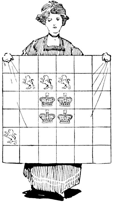 הגברת הצעירה באיור מתמודדת עם קושי קטן בגזירה, שבו הקורא ישמח לסייע לה. היא רוצה, מסיבה כלשהי שהיא לא מסרה לי, לחתוך את חתיכת הבד המרובעת והיקרה הזו לארבעה חלקים, כולם בדיוק באותו גודל ובאותה צורה, אבל חשוב שכל חתיכה תכיל אריה וכתר. מכיוון שהיא מתעקשת שהחתכים ייעשו רק לאורך הקווים המחלקים את הריבועים, היא נבוכה למדי לגלות איך לעשות זאת. האם תוכלו להראות לה את הדרך? יש רק שיטה אפשרית אחת לחתוך את הבד.