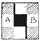 אנו נדון כאן בשאלה של אותם לוחות המכילים מספר אי-זוגי של משבצות. נניח שהמשבצת המרכזית נחתכת תחילה, כך שיישאר מספר זוגי של משבצות לחלוקה. כעת, ברור שלוח ריבוע שלוש על שלוש ניתן לחלוקה רק בדרך אחת, כפי שמוצג באיור `1`. ניתן לראות שהחלקים A ו-B הם באותו גודל וצורה, וכי כל דרך חיתוך אחרת תייצר רק חלקים בעלי צורה זהה, אז זכרו שווריאציות אלה אינן נספרות כדרכים שונות. החידה שאני מציע היא לחתוך את הלוח חמש על חמש (איור `2`) לשני חלקים באותו גודל וצורה בכמה שיותר דרכים שונות. הדגמתי באיור דרך אחת לעשות זאת. כמה דרכים שונות יש בסך הכל? חתיכה שכאשר הופכים אותה דומה לחתיכה אחרת אינה נחשבת כבעלת צורה שונה.